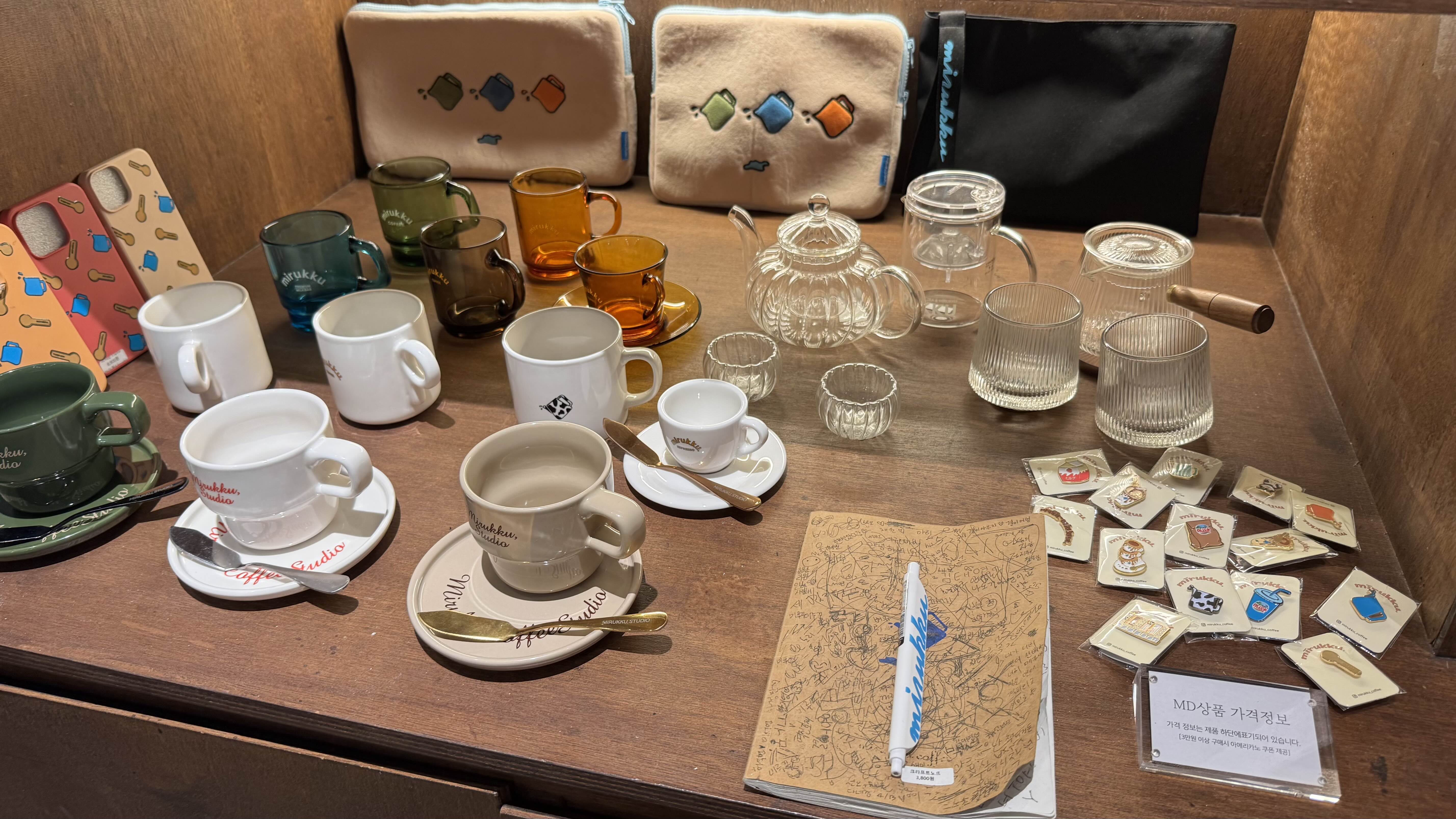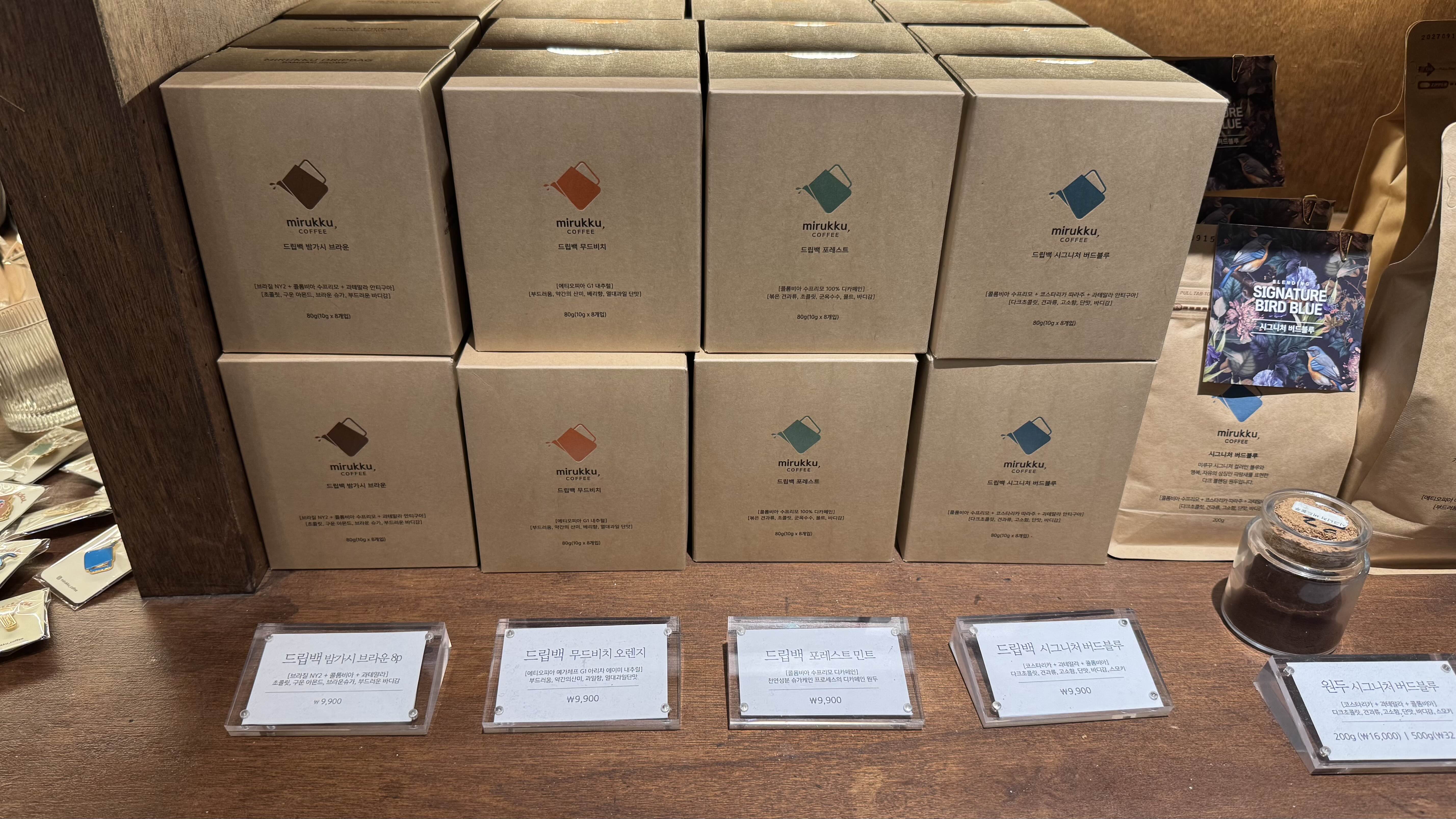 이번 방문에서는 디저트를 주문하지 않았습니다. 대신 매장에는 굿즈 코너가 있었는데, 가루 커피, 드립백, 컵 등 다양한 상품을 판매하고 있었습니다. 단순히 카페로서의 기능을 넘어 집에서도 미루꾸 커피를 즐길 수 있도록 준비된 점이 인상적이었어요.