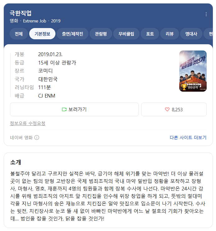 극한직업은 현재 넷플릭스, 유플러스, 웨이브, 애플티비, 티빙, 쿠팡플레이에서 보실 수 있습니다.