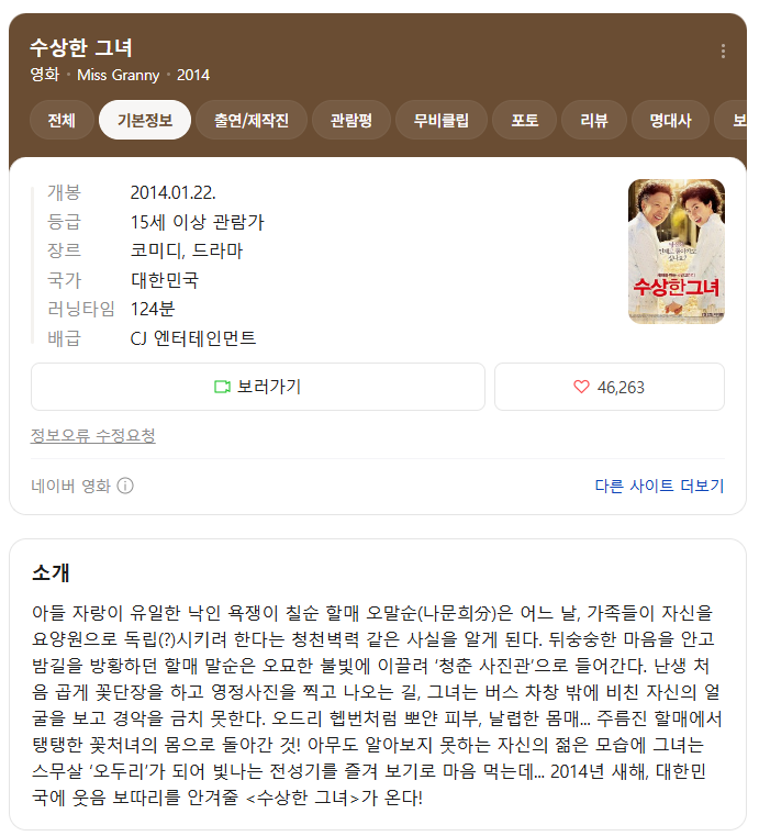 수상한 그녀는 거의 10년 전 영화이지만, 남녀노소 누구나 좋아하고, 공감할만한, 그리고 한 번쯤 꿈꿔볼 만한 내용이 들어갔기 때문에 세대를 막론하고 재밌게 볼 수 있는 영화라 추천드립니다.