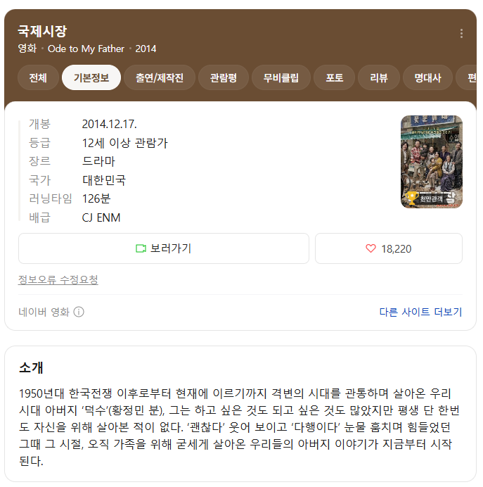 한 남자의 인생을 통해 한국 현대사를 담아낸 작품. 세대를 뛰어넘어 공감할 수 있는 가족 이야기로, 부모님과 함께 보기 좋은 영화입니다.