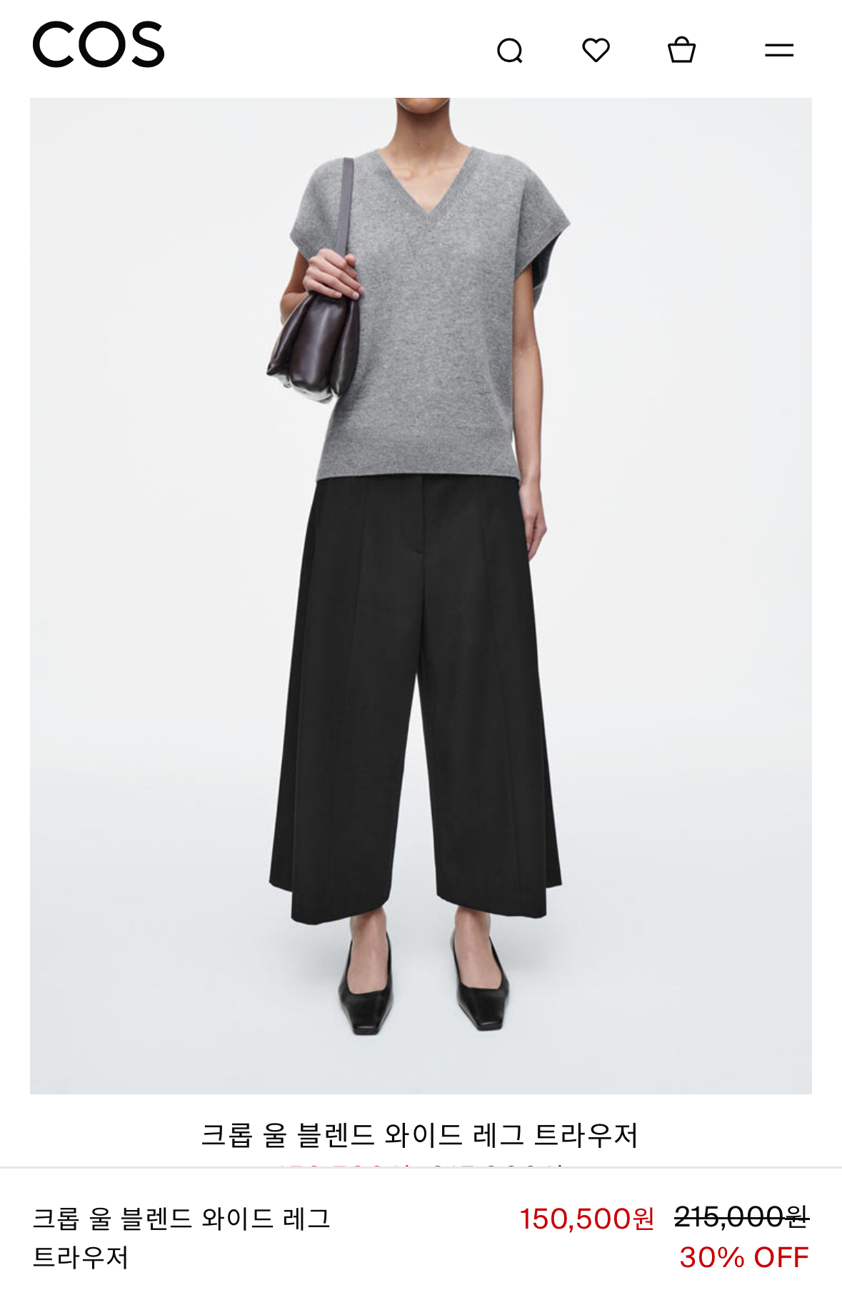 울 블렌드 소재로 보온성이 뛰어나면서도 와이드 레그 실루엣이 세련돼요. 크롭 길이라 하이웨이스트 탑이나 니트와 매치하면 다리가 길어 보이는 효과도 있고요. 세일가에 구입하면 겨울용 팬츠로 활용도 높습니다.