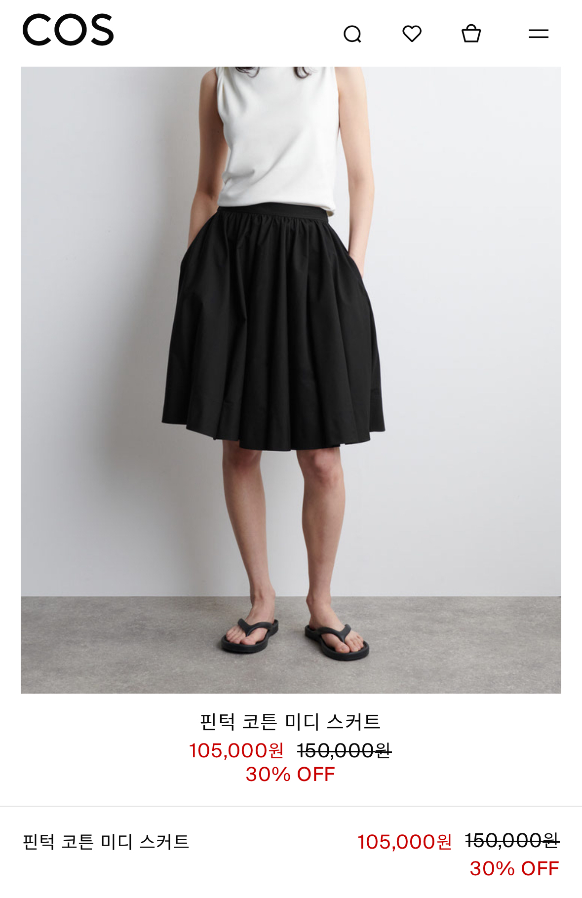 면 소재로 살짝 포멀한 느낌이 있으면서도 데일리 착장에도 잘 어울리는 스커트예요. 핀턱 디테일이 있어 무릎 아래 라인이 깔끔하게 떨어져서 다양한 상의와 매치하기 쉬웠어요.